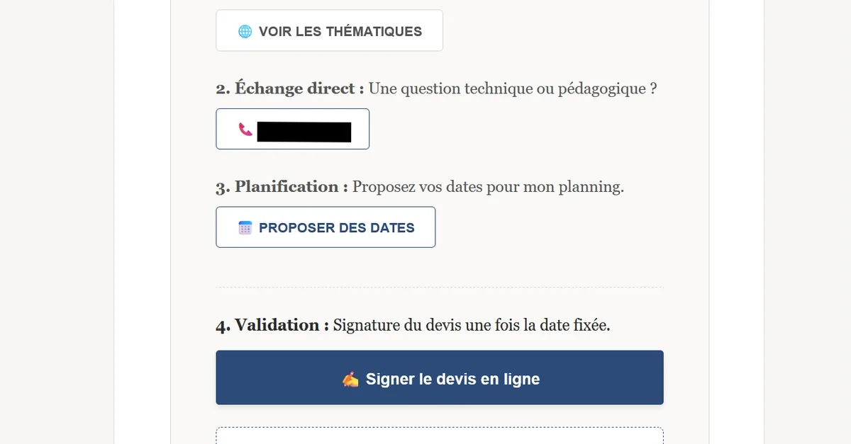 - Explore Themes, Propose Dates, Sign Online, Forward to Management 등 4개의 목적별 버튼으로 분기 경로 설계