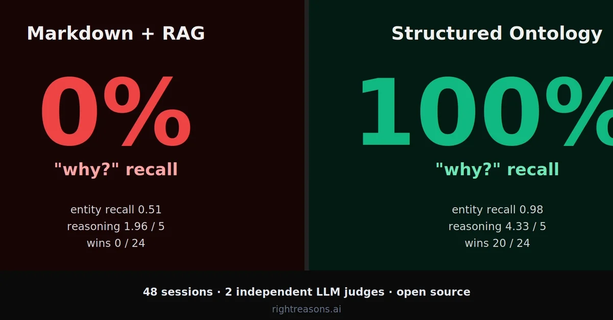 We tested structured ontology vs Markdown+RAG for AI agents — "why?" recall was 0% vs 100%