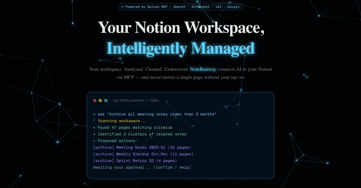 Notion MCP를 활용해 7가지 워크스페이스 관리 도구를 통합한 NoteRunway로 orphaned pages, 중복 노트, sensitive data를 자동 감지 및 정리