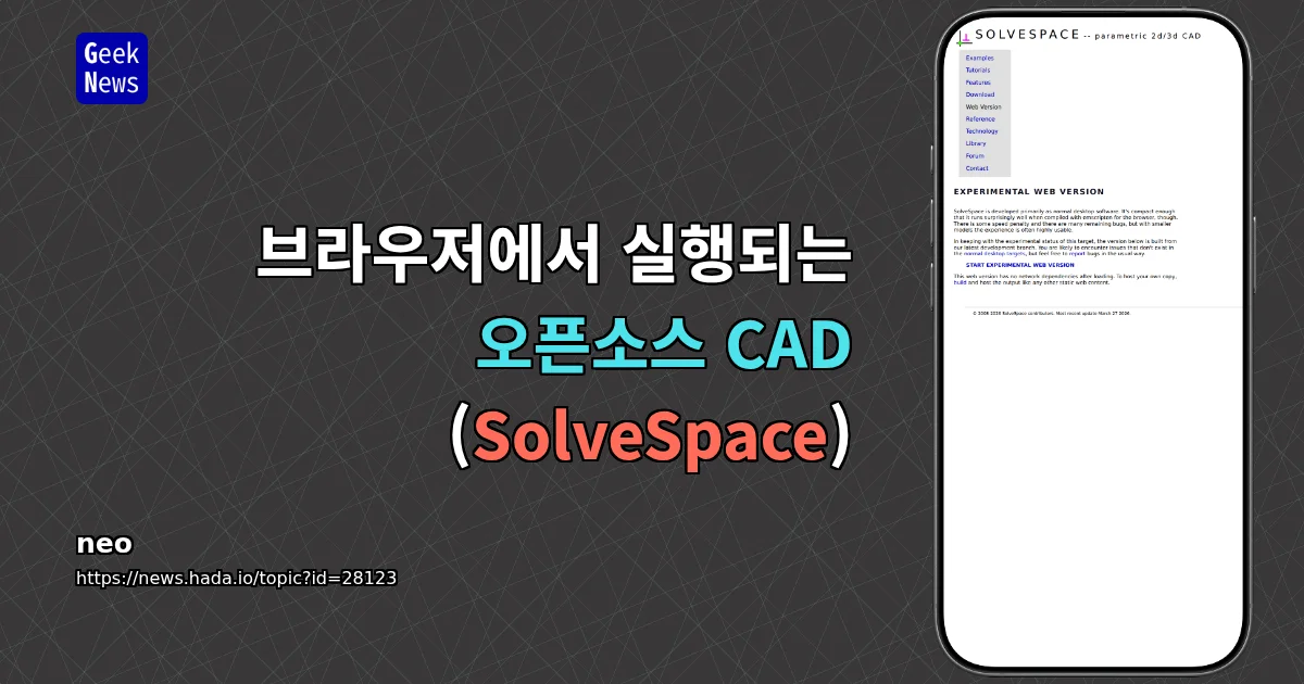 SolveSpace는 Emscripten으로 브라우저에서 실행되는 파라메트릭 CAD 도구이지만 개발 속도가 느려지고 chamfer 같은 기본 기능 구현에 한계가 있음. Dune 3D가 SolveSpace를 엔진으로 사용하며 정신적 후속작 역할을 함.
