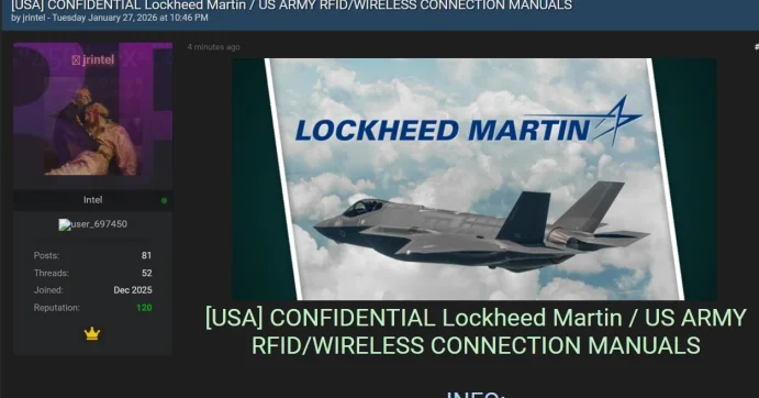 위협 행위자가 미국 방산 기업 Lockheed Martin의 RFID 및 무선 애플리케이션 관련 기밀 문서를 다크웹에서 유출·판매한다고 주장