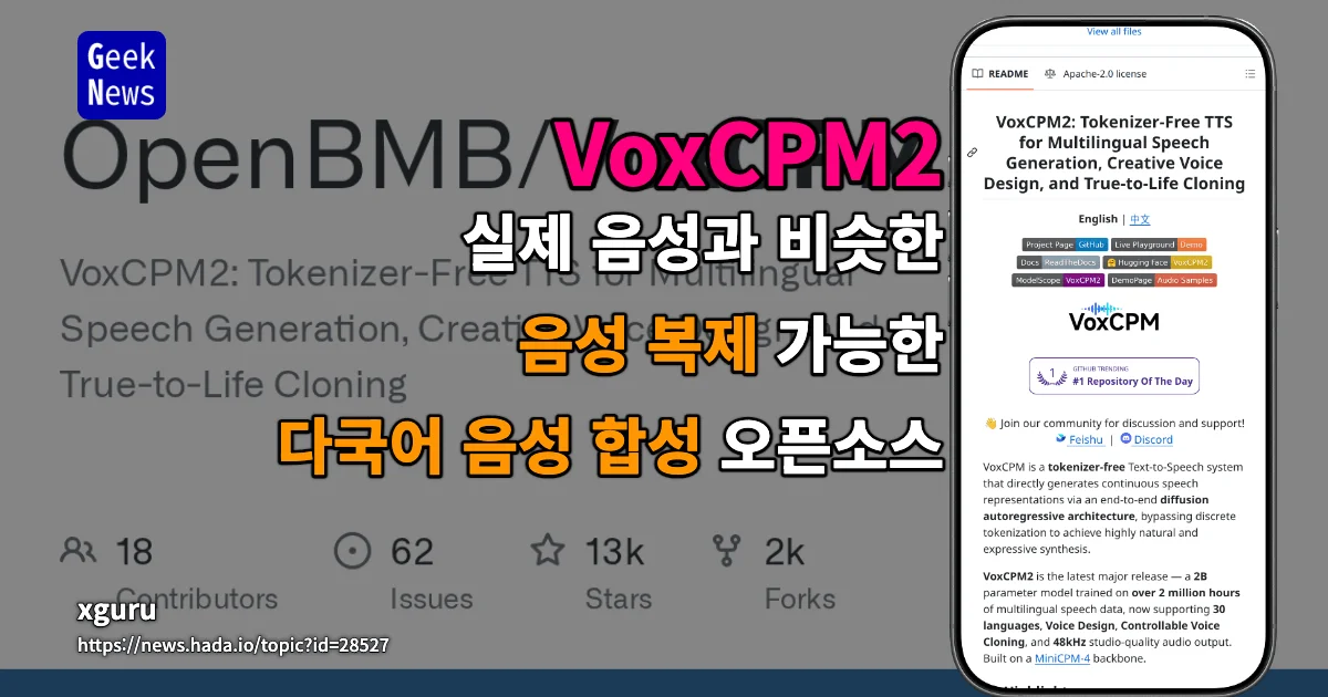 VoxCPM2 - 실제 음성과 비슷한 음성 복제 가능한 다국어 음성 합성 오픈소스