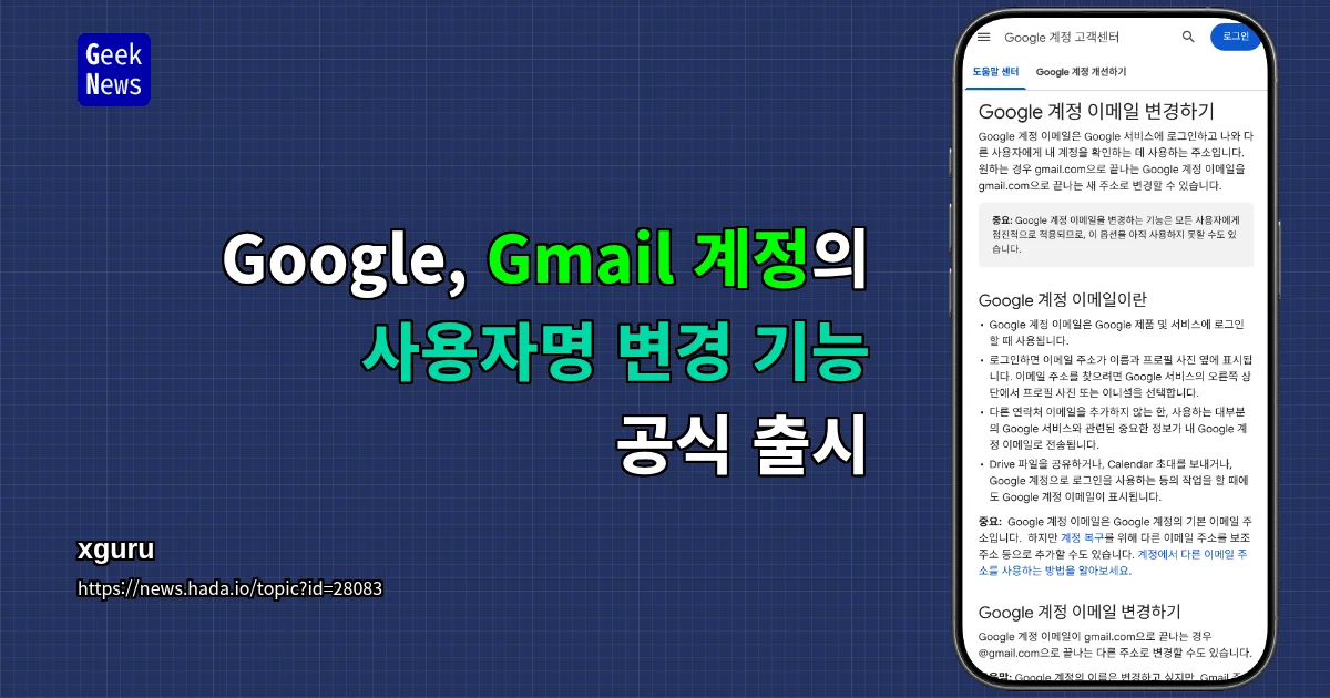 Google, Gmail 사용자명 변경 기능 출시 — 1년에 1회 총 3회까지 기존 주소는 alias로 유지