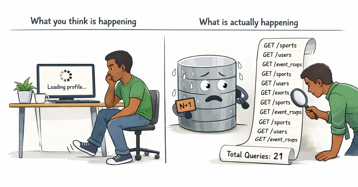 프로필 엔드포인트가 AI로 생성한 모듈식 코드로 인해 단일 요청에서 20개 이상의 데이터베이스 쿼리를 실행하는 N+1 문제 발생