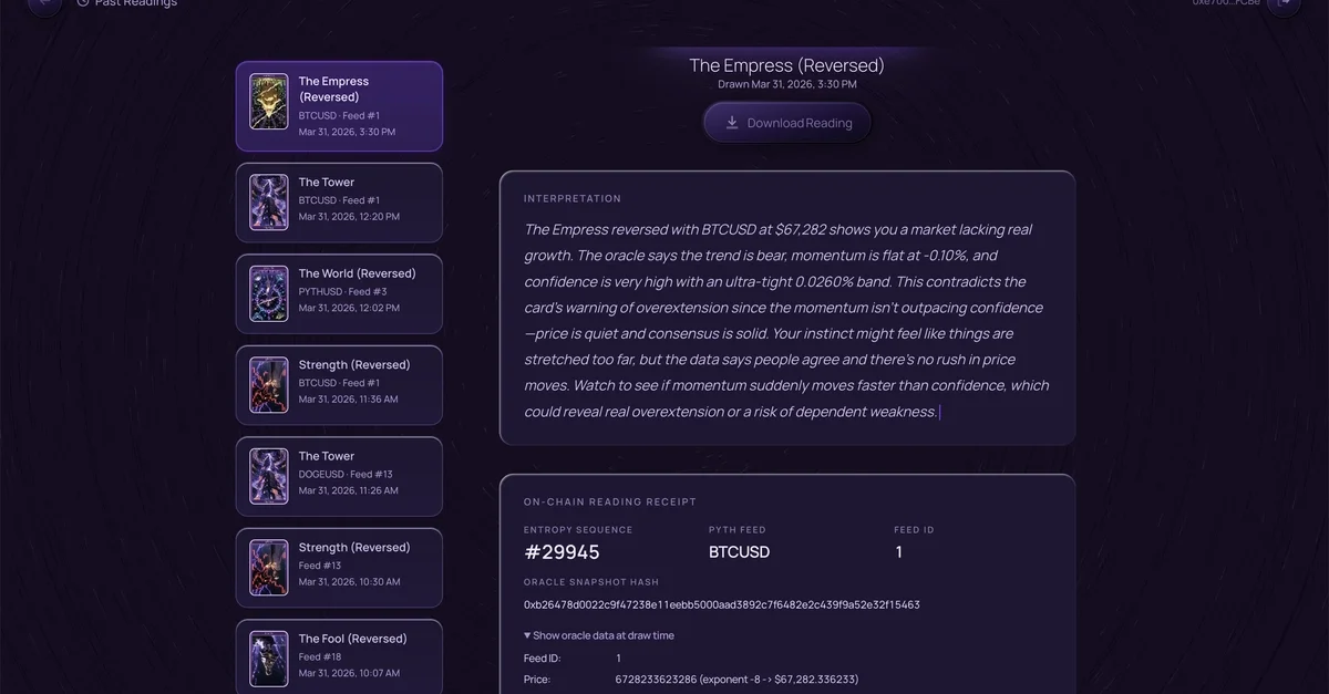 개발자가 Pyth 오라클을 활용하여 시장 데이터를 검증 가능한 타로 리딩으로 변환하는 Orra 앱을 구축했다