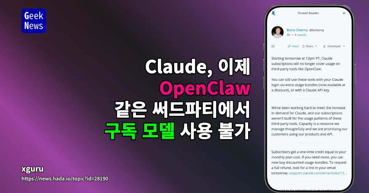 - OpenClaw 등 서드파티 툴의 구독 모델 접근을 차단하고 API 키 기반의 종량제 과금 체계로 전환 유도