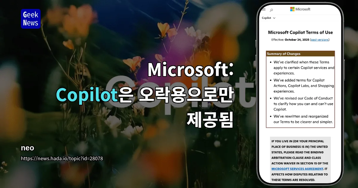 Microsoft Copilot의 ToS에 European IP 접속 시 '상업적 사용 금지' 조항이 추가됨. 영국 버전 ToS 134번째 줄에도 동일 조항이 새로 삽입됨.