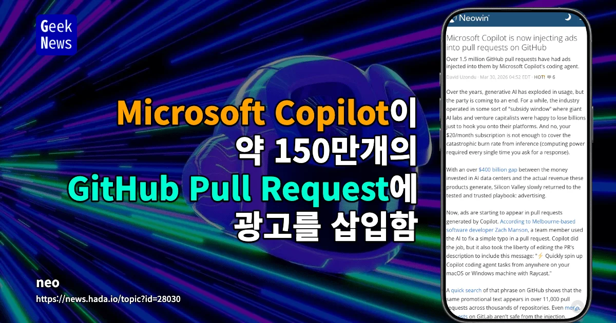 - Neowin → 약 150만 건 이상의 GitHub PR에서 광고 삽입 사례 확인 및 조사
