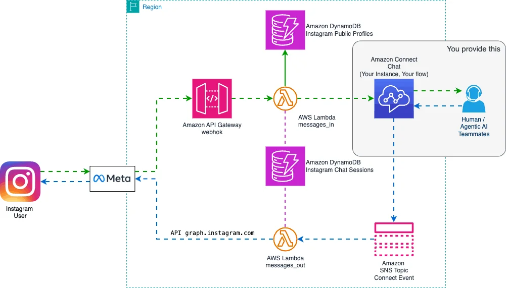 인스타그램 Business 계정과 Amazon Connect 연동 시 Lambda 웹훅 핸들러 + DynamoDB 세션/프로필 캐시 구성으로 별도 중개 서비스 없이 직접 메시지 라우팅 가능