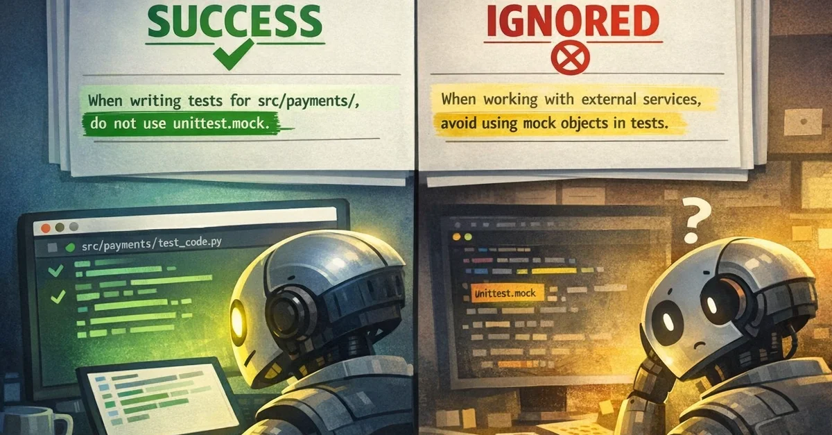 AI 모델을 활용하는 개발 팀이 명령어나 가이드라인 파일을 작성할 때, "서비스", "라이브러리", "오류" 같은 카테고리 단어를 "unittest.mock", "stripe.Customer.create()", "cursor.execute()" 같은 실제 코드 구성 요소로 치환하고, "When working with..." 같은 광범위 조건을 정확한 파일 경로나 무조건적 명령어로 변경하면 규칙 준수율을 10배 이상 향상시킬 수 있다.
