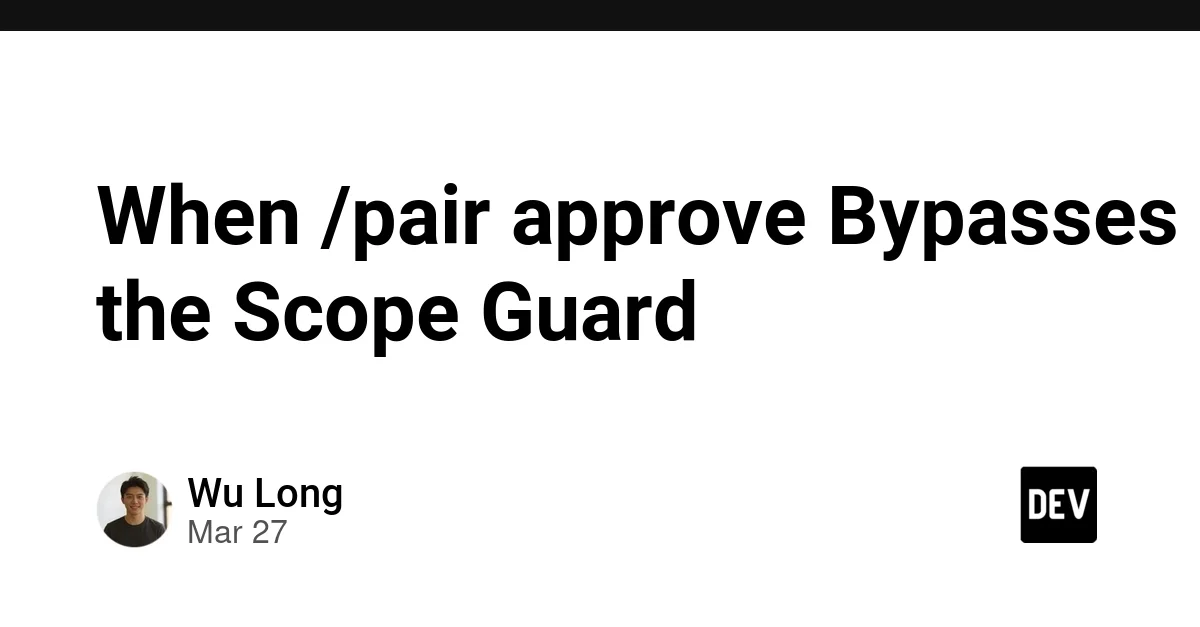 OpenClaw의 approveDevicePairing 함수는 callerScopes 파라미터를 선택적으로 받아 권한을 검증하는 견고한 설계를 갖추고 있었다. 하지만 이 함수를 호출하는 /pair approve 슬래시 커맨드 경로가 callerScopes를 전달하지 않았고, 함수의 선택적 파라미터가 누락 시 호출자를 신뢰한다는 가정과 충돌하면서 보안 검증 우회가 발생했다.