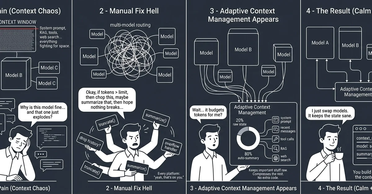 다중 LLM 라우팅 환경에서 모델별 컨텍스트 창 크기가 상이하여 대규모 컨텍스트가 작은 모델로 전환 시 정보 손실이 발생한다. 기존 방식은 개발자가 모델마다 개별적으로 트렁케이션 및 요약 로직을 구현해야 하며, 이는 brittle한 코드를 야기한다.