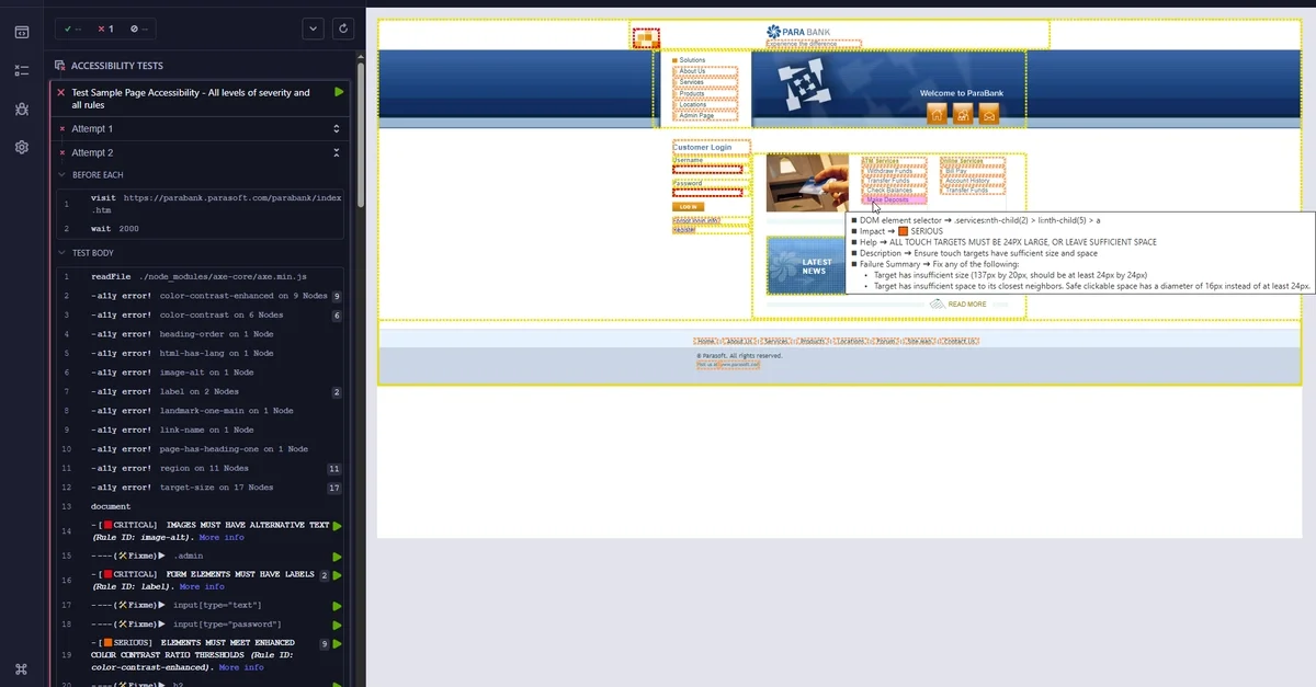 - [cy.checkAccessibility()] → [severity별 그룹화된 로그와 DOM 요소 색상 코딩 테두리 자동 표시]