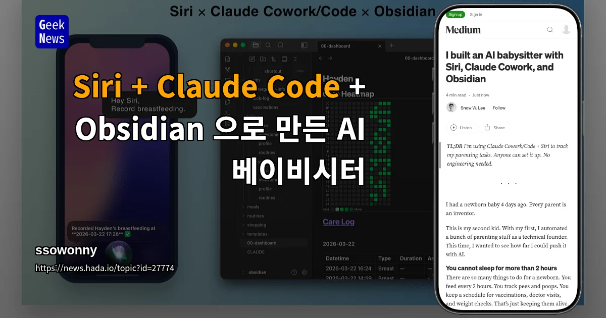 신생아 육아 중 음성 명령으로 수유·배변 기록을 자동 추가하는 시스템을 Siri + Claude Code + Obsidian 조합으로 구축한 사례