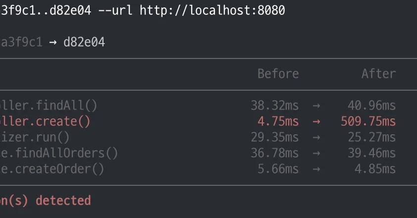 - Spring Boot Actuator Endpoint를 통해 두 Commit Hash 간의 Latency Delta를 계산하는 비교 로직 구현