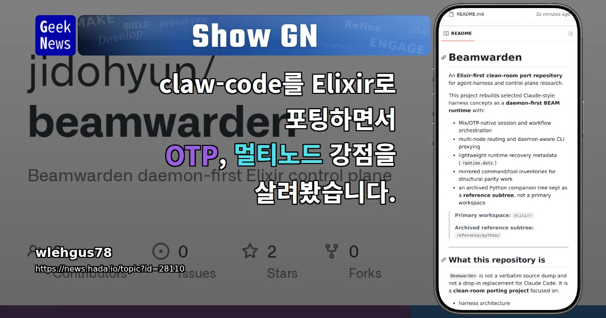 Python 기반의 claw-code agent runtime을 Elixir로 포팅하는 실험을 진행함. 단순 1:1 포팅보다는 Elixir/OTP의 강점을 활용한 아키텍처 재설계를 목표로 함.