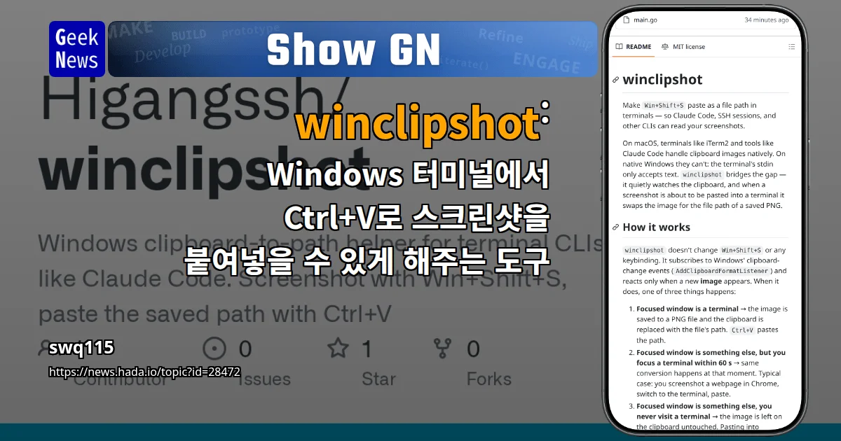 Show GN: winclipshot: Windows 터미널에서 Ctrl+V로 스크린샷을 붙여넣을 수 있게 해주는 도구