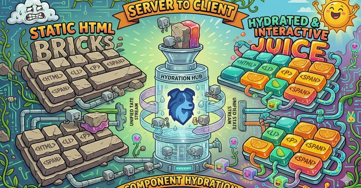 - 부분 하이드레이션 가능 구조: initState() 플래그 체크로 인터랙티브 컴포넌트만 선택적으로 하이드레이션 (Astro 패턴 유사)