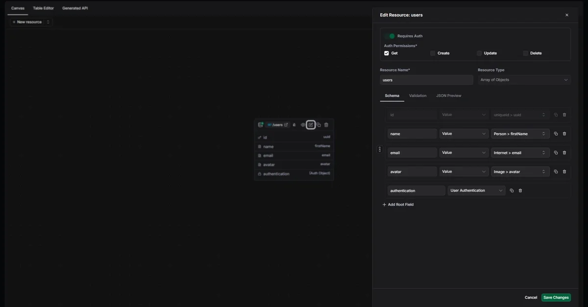 - 비주얼 캔버스를 통한 리소스 모델링: 수동 JSON 구조화 대신 드래그-드롭 방식의 API 관계도 설계