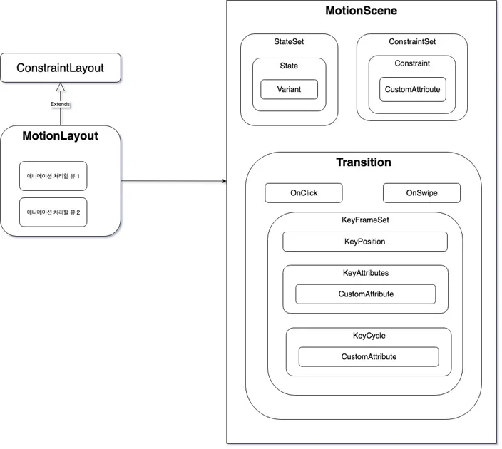 - ConstraintSet을 통해 별도 레이아웃 파일 없이 View의 위치·크기·커스텀 속성을 직접 정의: start 상태와 end 상태를 XML에 선언