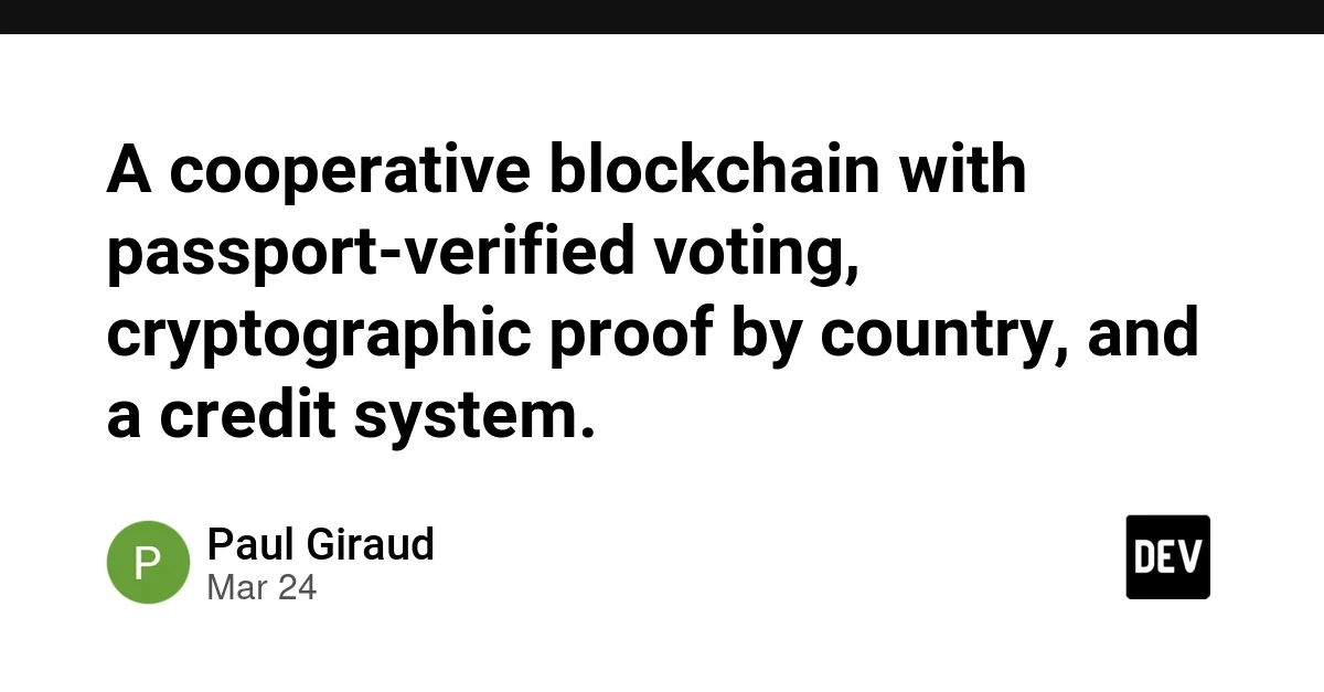 A cooperative blockchain with passport-verified voting, cryptographic proof by country, and a credit system.