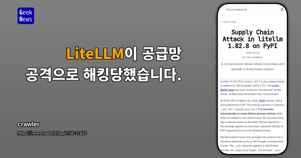 LiteLLM의 1.82.7 버전과 1.82.8 버전에서 공급망 공격이 발생했다. 관리자가 해킹 의심 관련 GitHub 이슈를 아무 설명 없이 종료하여 보안 사건의 신뢰성이 높아진 상황이다.