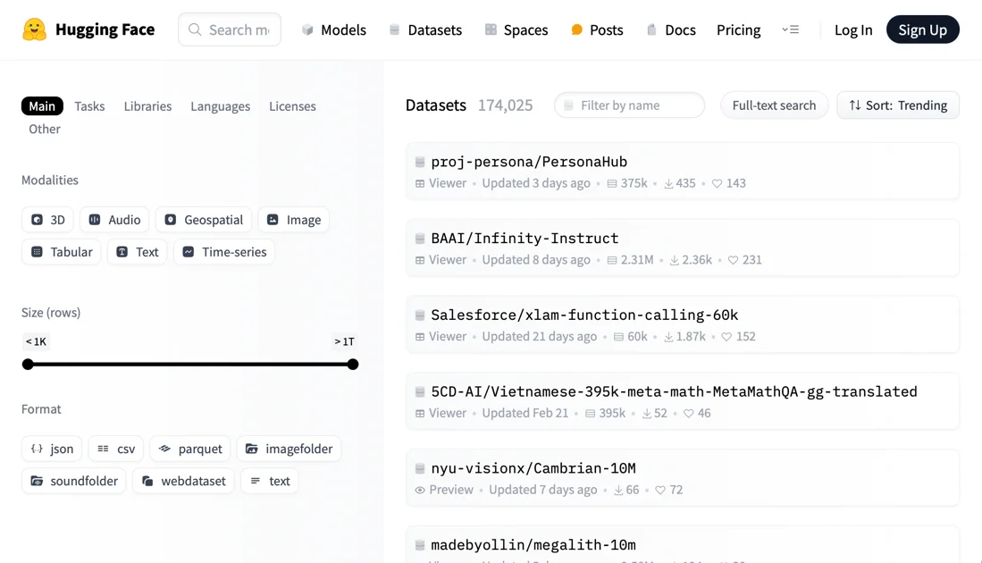Hugging Face Dataset Hub이 4가지 검색 필터(Modality, Size, Format, Library)를 추가해 180,000개 데이터셋의 발견성 및 접근성 향상