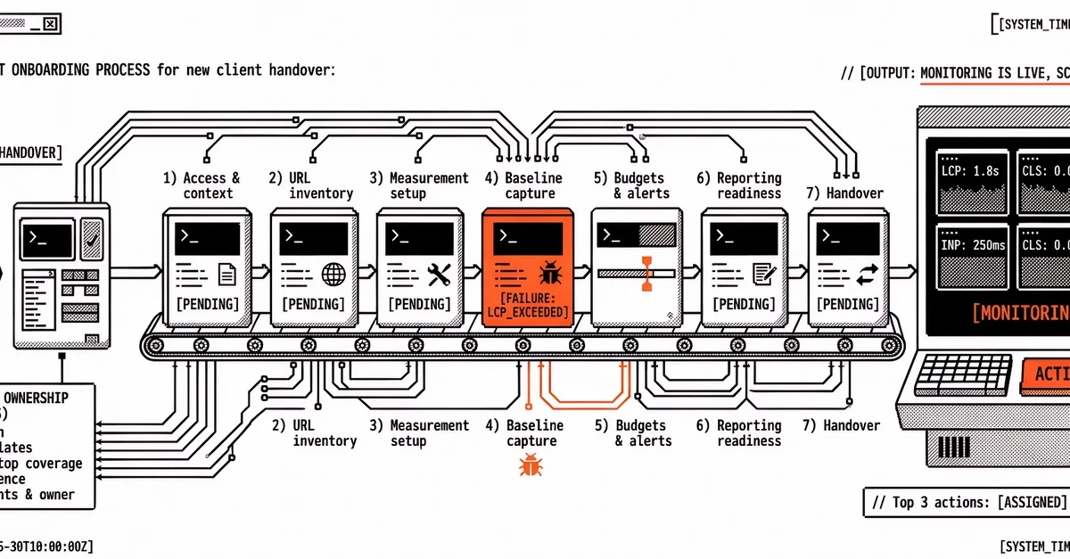 에이전시 클라이언트 온보딩에서 성능 모니터링 도구 설정 전에 5개 핵심 항목(도메인, 우선순위 템플릿, 디바이스 범위, 보고 주기, 알림 수신자)을 먼저 확정하면 첫 모니터링 사이클에서 결정 가능한 데이터를 확보할 수 있다