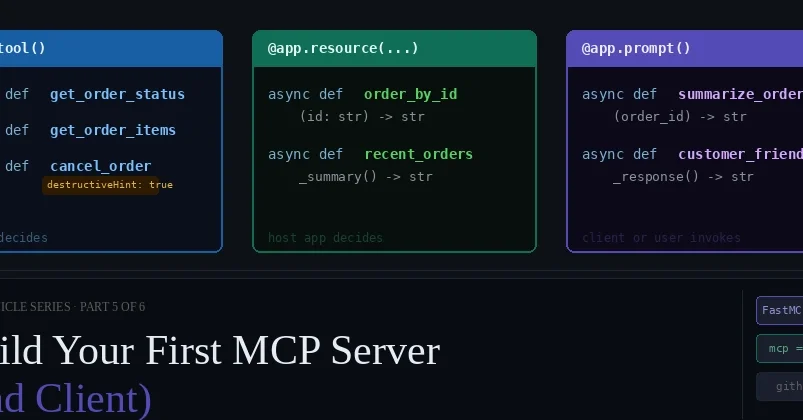 MCP(Model Context Protocol) 서버를 Python FastMCP SDK로 구현해 Tools, Resources, Prompts 세 가지 capability 타입을 통해 eCommerce 주문 시스템을 클라이언트에 노출