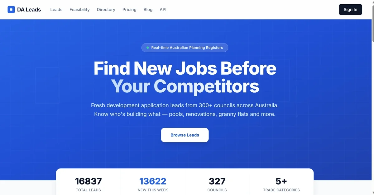 오스트레일리아의 DA(Development Application) 데이터는 공개 정보이지만 기존 부동산 및 건설 기술 제품은 실시간 현장 신호를缺乏합니다. 개발업자와 건설업체는 이론적인 구역 용량만 확인하며 실제 건축 동향을 파악하기 어렵습니다.