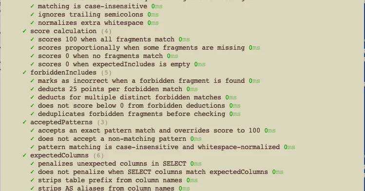 - 필수 키워드 포함 여부, 금지 패턴 탐지, 컬럼 유효성 검사 등 다각도 검증 시나리오 설계
