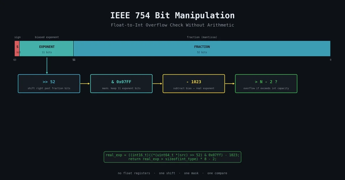 - IEEE 754 표준의 Bias 값을 뺀 Real Exponent를 산출하여 정수 타입의 비트 너비와 직접 비교하는 로직 설계